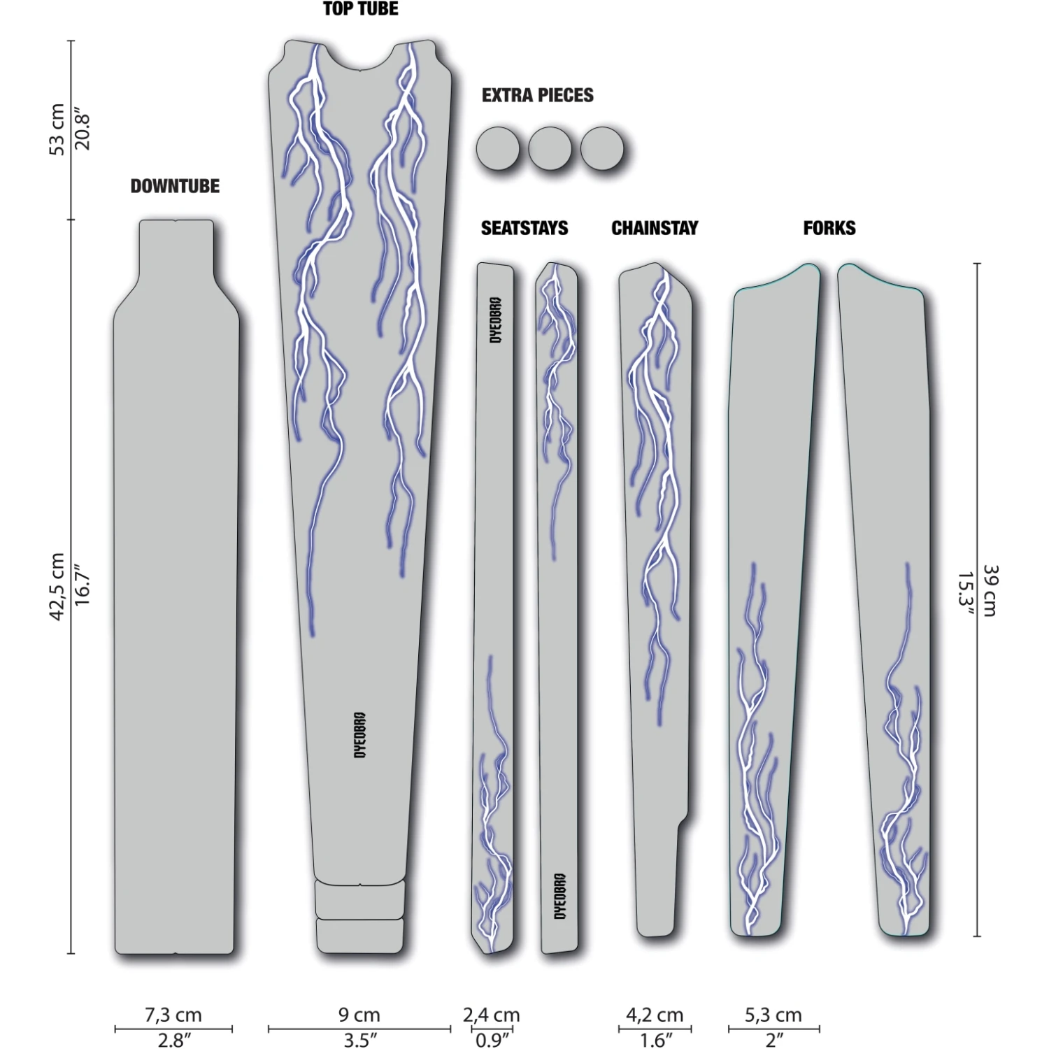 Ontworpen om de bovenbuis, onderbuis, vork, seatstays en chainstays te beschermen met in totaal 12 onderdelen.