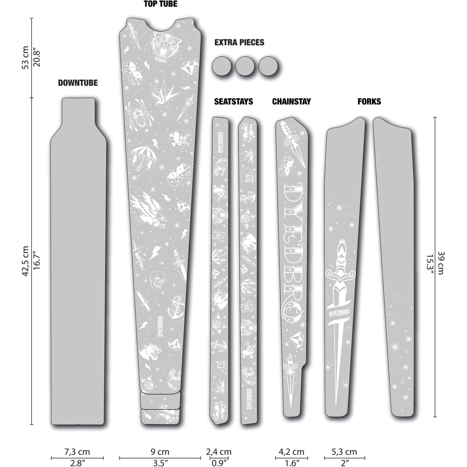 Ontworpen om de bovenbuis, onderbuis, vork, seatstays en chainstays te beschermen met in totaal 12 onderdelen.