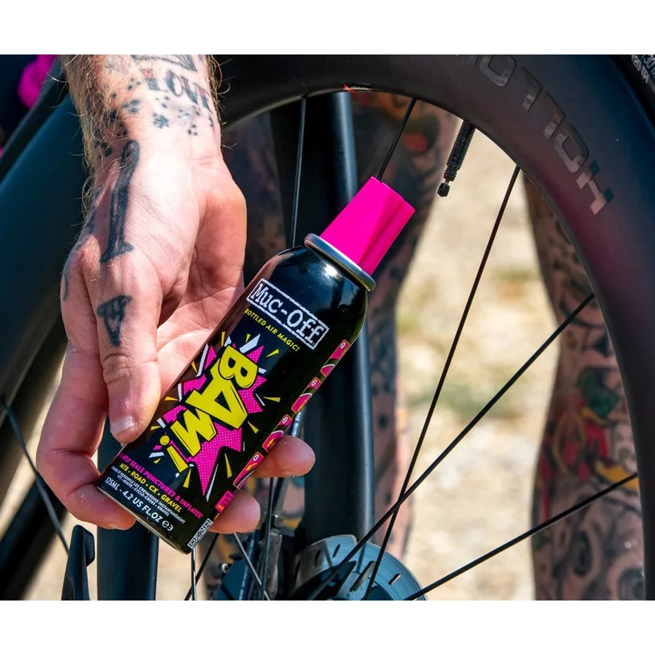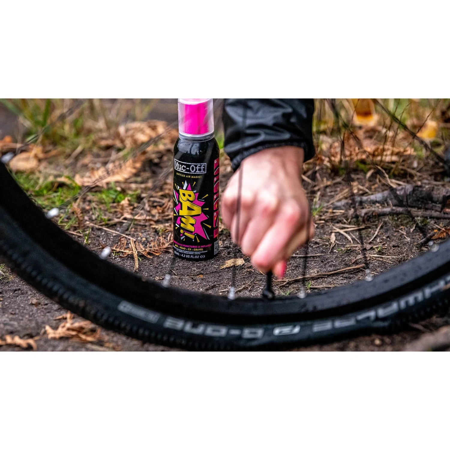 De Muc-Off B.A.M! pompt en repareert tegelijkertijd door latexschuim en lucht in de band te injecteren. De perfecte noodhulp om banden in een minuut te vullen en gaten tot 4 mm te dichten.
