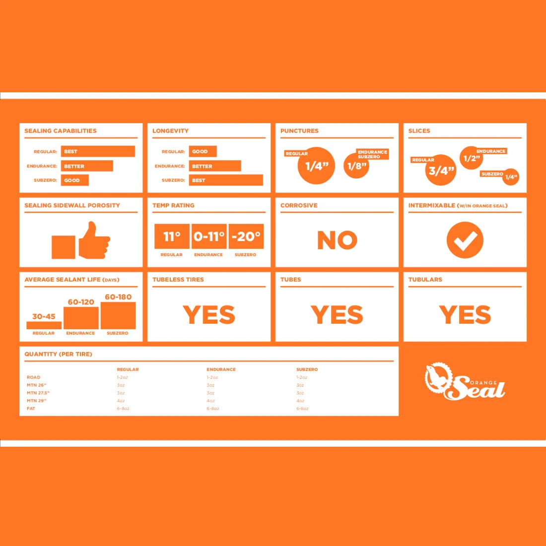 ORANGE SEAL Regular Tubeless Sealant heeft bewezen grote te dichten en werkt betrouwbaar bij verschillende temperaturen.