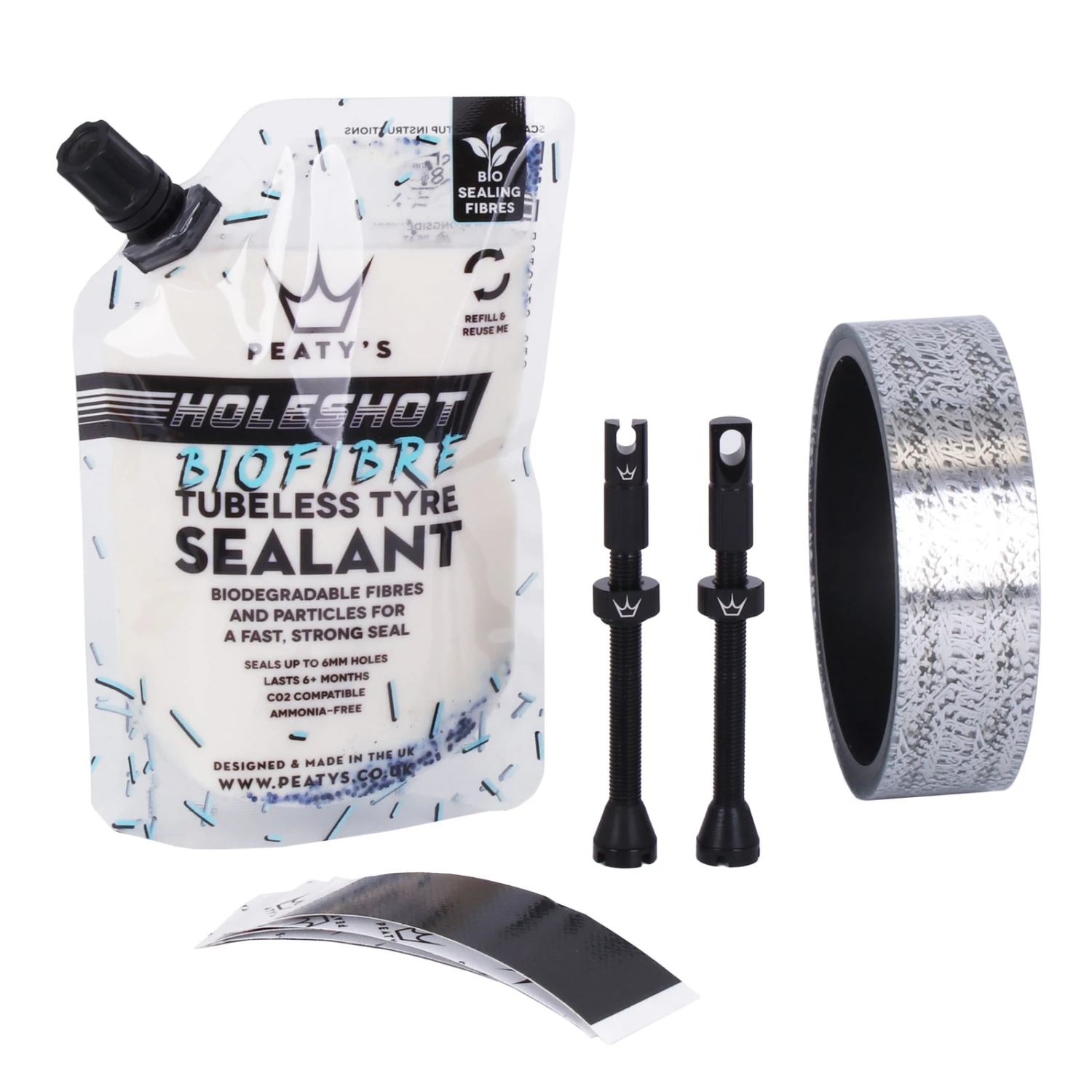 Alles wat je nodig hebt voor een volledig geoptimaliseerde tubeless set-up! – Inclusief Peaty’s nieuwste zilver bedrukte tubeless velglint. Ideaal voor rijders die meer tijd op de fiets willen doorbrengen en minder tijd willen besteden aan het repareren van lekke banden.