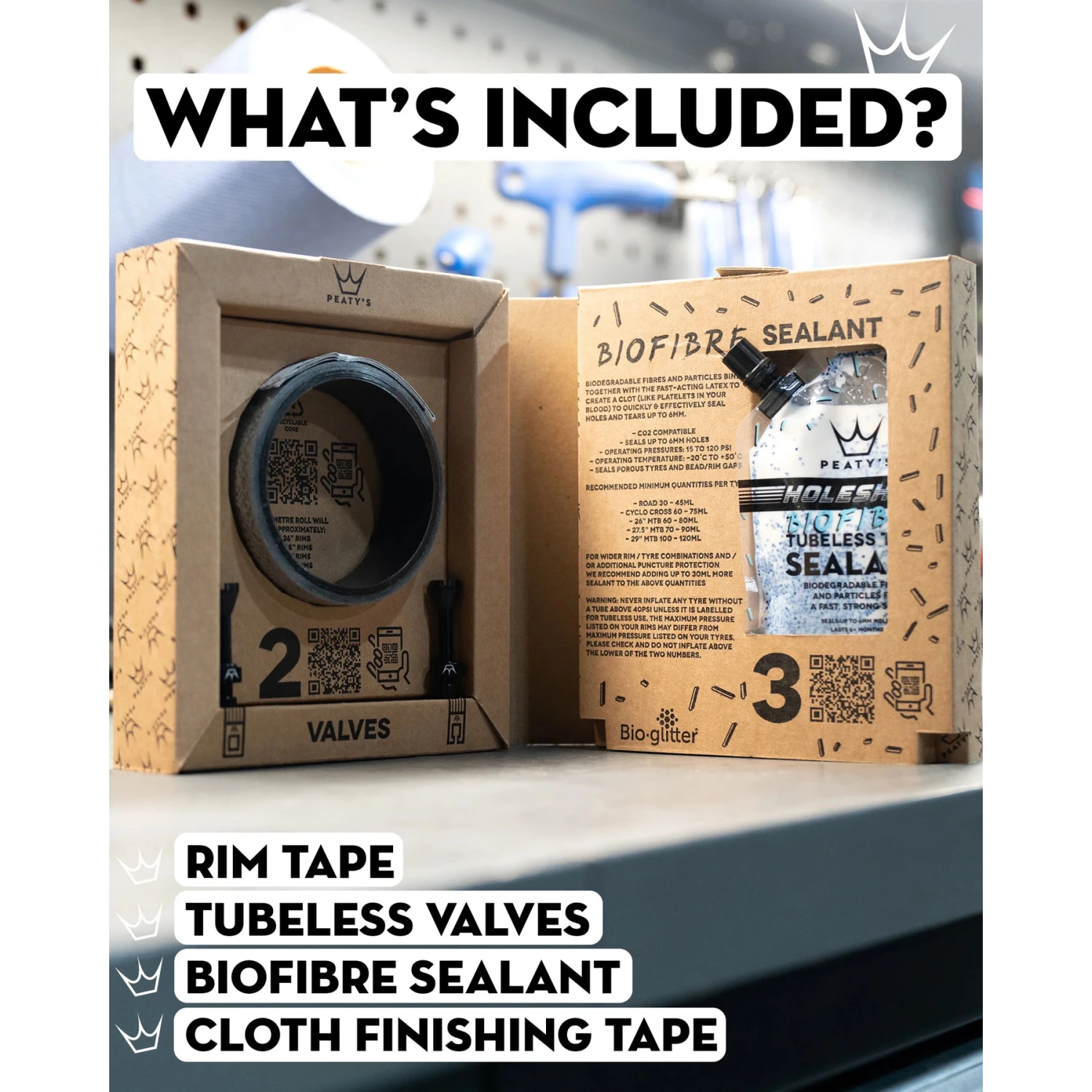 Alles wat je nodig hebt voor een volledig geoptimaliseerde tubeless set-up! – Inclusief Peaty’s nieuwste zilver bedrukte tubeless velglint. Ideaal voor rijders die meer tijd op de fiets willen doorbrengen en minder tijd willen besteden aan het repareren van lekke banden.