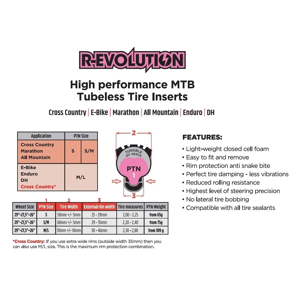 Het vlaggenschip R-Evolution breidt het PTN-portfolio uit met de reeds bestaande en succesvolle PTN-producten Rokkline en RaceLine. Het staat voor de hoogste eisen en voor hoge prestaties. Naast de goede eigenschappen van Rokkline en Raceline biedt R-Evolution een maximale stabiliteit van de zijwand van de band (nauwkeurig sturen) en de beste bescherming tegen burbing (omrollen van de zijwand van de band). Daarbij komt een goede velgbescherming met een zeer lage rolweerstand op alle ondergronden. Dankzij een intelligent ontwerp en de keuze van materialen kon een laag gewicht worden bereikt. De PTN R-Evolution 29 S XC Marathon weegt slechts 68 g. Het daaruit voortvloeiende assortiment omvat alle modellen die ambitieuze motorrijders nodig hebben. De grootte en zelfs de vormstructuur worden aangepast aan de desbetreffende toepassing. Geen enkele andere fabrikant ter wereld biedt dergelijke mogelijkheden.