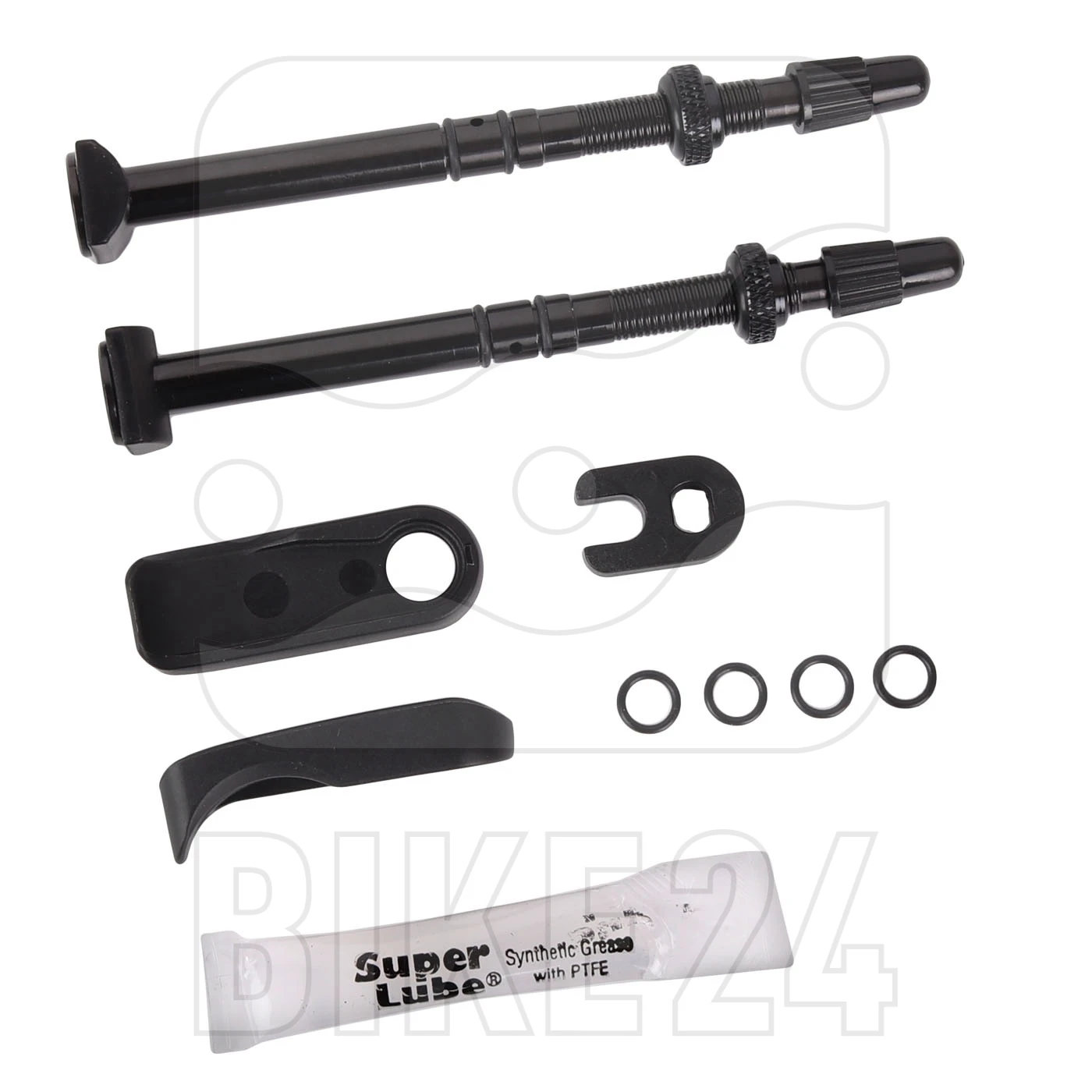 Bevat twee binnenbandloze ventielen, twee velglinten, 4 O-ringen en een gereedschap voor het verwijderen van het ventielinzetstuk.